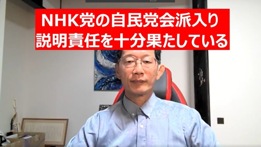 NHK党としては、NHKから国民を守るための施策を進めるために、斎藤健一郎議員の方から会派入りを申し入れ、自民党が受け入れてくれたことに感謝していました。
