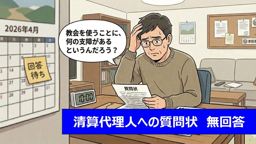 この動画でもご報告いたしましたが、3月24日、私物を取り戻すことができるという期日があって、清算代理人の立ち会いのもと、私たちの地元の教会に私物を取りに行きました。その時に、APTFで購入した街宣用のスピーカーとかを私は持って帰りましたが、その際に、清算代理人に質問状を出しました。